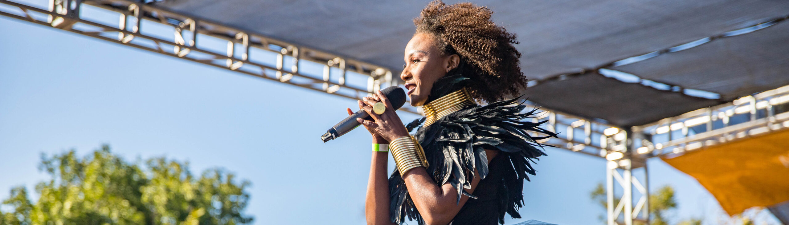On a sunny outdoor stage, a singer holds a microphone as the wind blows her brown curly hair out behind her. She is wearing stacked gold rings around her throat and wrists, and has a collar made of long black feathers around her neck and chest. She is a warrior, and superhero.